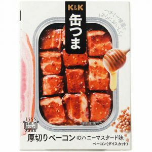 肴で、酒はうまくなる。缶つまは、お酒に合う厳選された素材や、素材を活かした製法、メニューづくりにこだわり続けます。サイコロ状にカットしたベーコンを使用。はちみつとマスタードで味付け、甘みと酸味が織りなす至福の逸品。