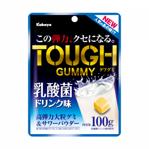 タフグミの新フレーバー。乳酸菌ドリンクのような爽やかで、甘酸っぱい味わい。クセになる高弾力食感の大粒グミです。爽やかで甘酸っぱい乳酸菌ドリンク味。たっぷり楽しめる大容量タイプです。